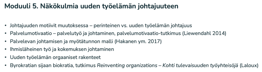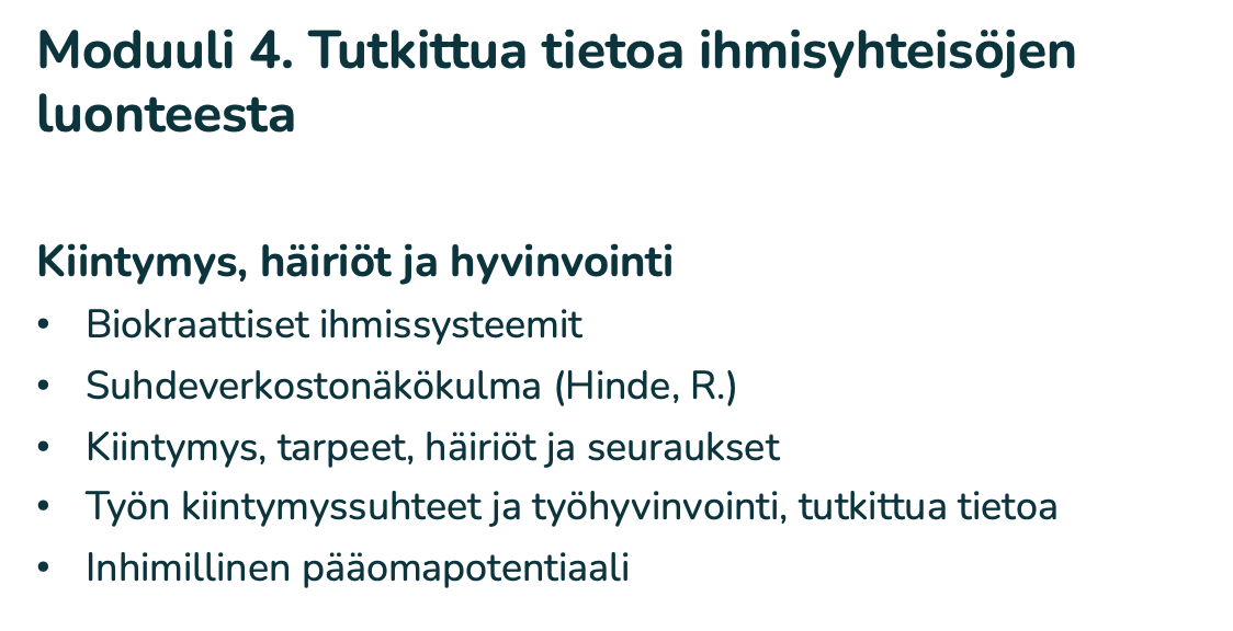 Jokaiseen moduuliin sisältyy luentovideoiden (kesto yht. 4h) lisäksi omaa oppimista tukevia pohdintatehtäviä, oheislukemistoa sekä ohjeistettuja tietoisen läsnäolon kokemuksellisia harjoitteita.