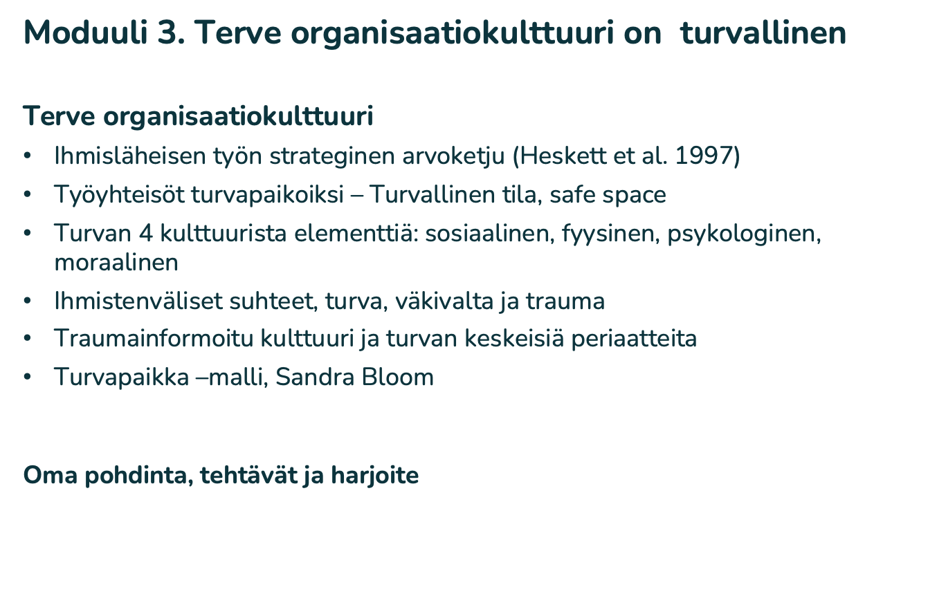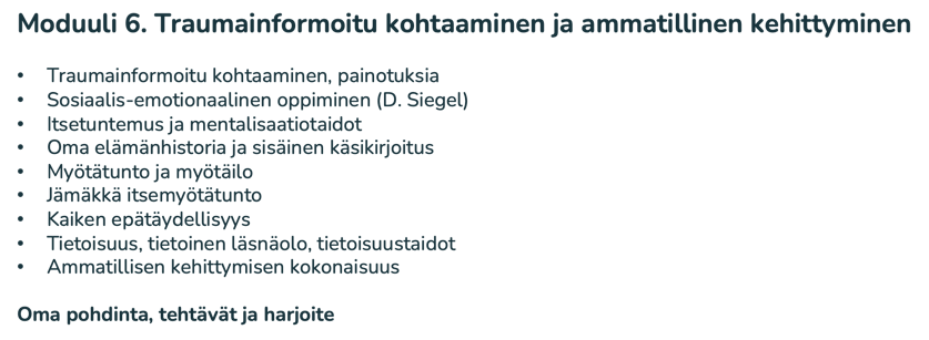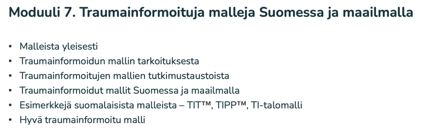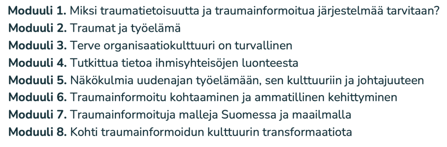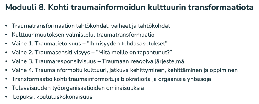 Tämän 8 sisältömoduulia sisältävän koulutuksen ajankäyttöarvio on ~8h. Koulutuksen tavoitteena on tarjota osallistujille perusymmärrys traumatietoisuudesta ja traumainformoidusta työotteesta terveen organisaatiokulttuurin sekä turvallisen ja resilientin työympäristön perustana.